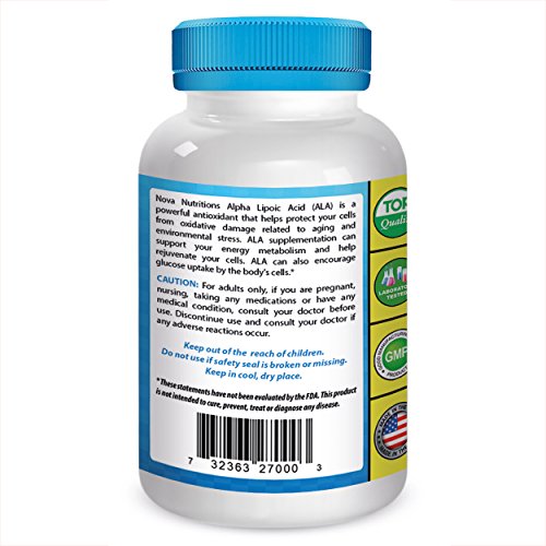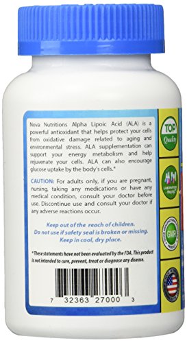 -. Binding : Health and Beauty -. Brand : Nova Nutritions -. EAN : 0732363270003 -. Feature : Helps to metabolize sugar in the body* / Powerful Universal Antioxidant* / Helps fight cell damaging free readicals in the body* / Helps support nerbe, liver and antioxidant health* / Protects Cells From Oxidative Damage Related to Aging and Environmental Stress* -. Label : Nova Nutritions -. LegalDisclaimer : * These statements have not been evaluated by the Food and Drug Administration. This product is not intended to diagnose, treat, cure or prevent any disease. -. Manufacturer : Nova Nutritions -. ProductGroup : Health and Beauty -. ProductTypeName : HEALTH_PERSONAL_CARE -. Publisher : Nova Nutritions -. Studio : Nova Nutritions -. Title : Alpha Lipoic Acid 600 mg 120 Capsules by Nova Nutritions -. UPC : 732363270003