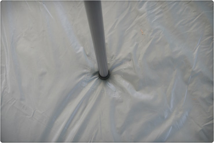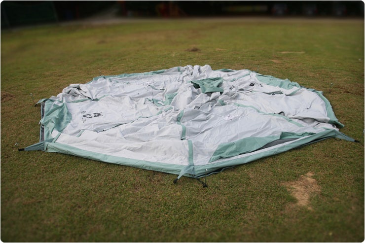 설치순서 2 : 방수포위에 텐트를 각에 맞게 올려놓아 펼칩니다.