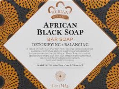 (2)Twin Pack Nubian Heritage 5 Ounce African Black Soap Bar Soaps Ingredients 100% Vegetable Soap: African black soap base, coconut oil and/or palm oil, butyrospermum parkii (shea butter), avena sativa (oat) kernel meal, aloe barbadensis leaf juice, plantain extract, tocopherol (vitamin E), vegetable glycerin, mineral pigment or vegetable color, essential oil blend.Feature