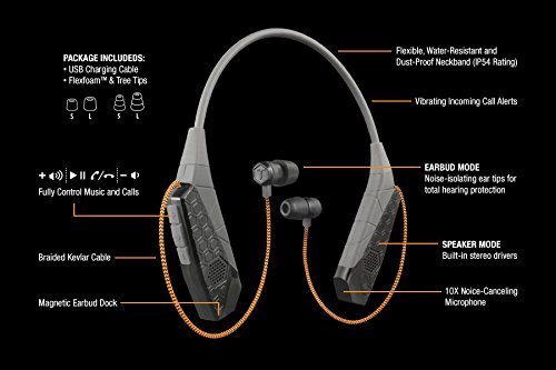 -. Feature : Heavy-Duty rubberized design with comfortable, flexible neck band / Bluetooth 4.1 for longer range and battery life / 100 hours standby/10 hours talk time/Up to 20 hours music play time / Noise reduction rating (NRR) of 23db / Audio/voice streaming with multiple voice commands: