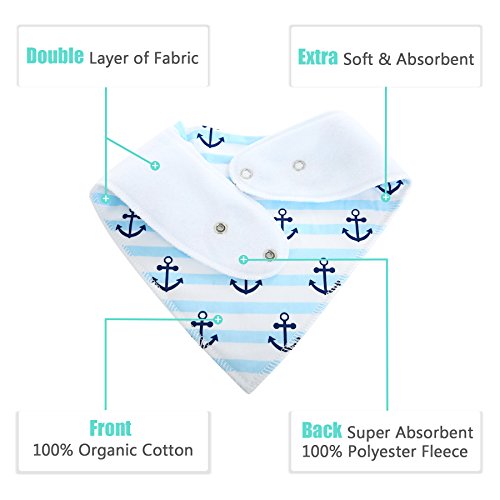 ?Double Layer SMART Moisture Management - Front layer made up of 100% organic cotton and back layer of polyester fleece for EASY, FAST drying ?Neutral Modern Cute Prints, ideal for both baby girls and boys ?Adjustable 2-Snap Closure Design to ensure perfect fit from your baby's 3rd month all the way through the 24th ?Hypoallergenic, NICKEL-FREE Snap Closures to eliminate skin allergies ?Sturdy Stitching Superior Finish ?Stylish design, not covering up the baby's outfit, but ACCESSORIZING it ?Peerless Comfort, velvety-soft feel