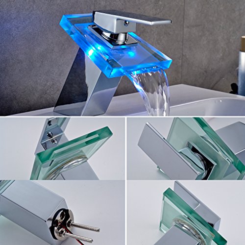 Auralum LED Glass Waterfall Faucet Bathroom Basin Sink Faucet Chrome Finish with 3 Color Changing RGB Lights Faucets LED RGB 2