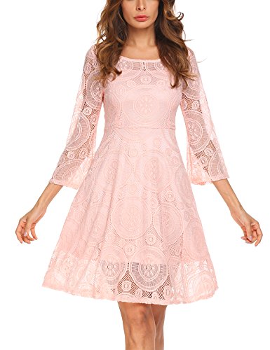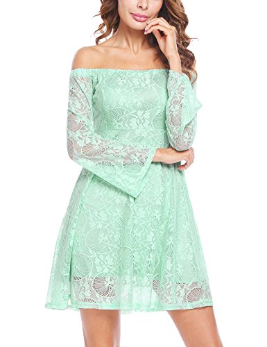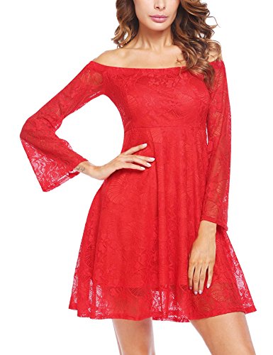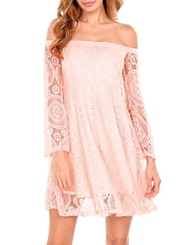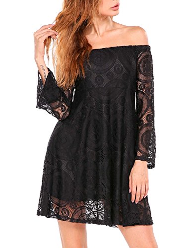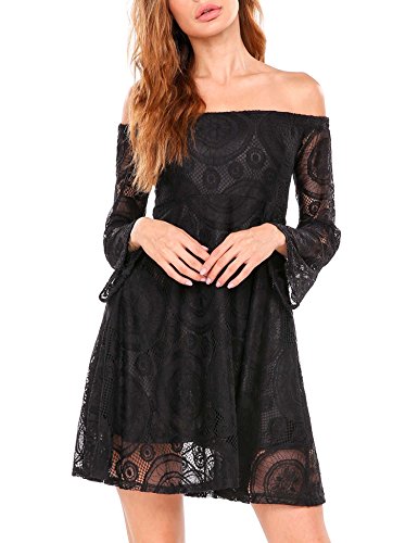 Off the shoulder, flare long sleeve, A-line, crochet lace fabric, with lining. This sexy dress is very attractive and easy drawing attention