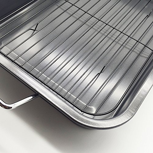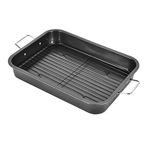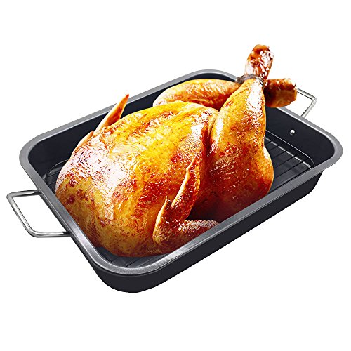 Studio : HOMOW Publisher : HOMOW Product Description 19.7-inch roaster ideal for roasting 25-pound turkey. Oven safe to 450 degrees Fahrenheit, the roasting pan has superior nonstick for easy food release and cleanup; wide handles allow a confident grip. The strong flat rack in this durable roaster is perfect for keeping meats elevated so that fat can drip away into the bottom of the pan. 0