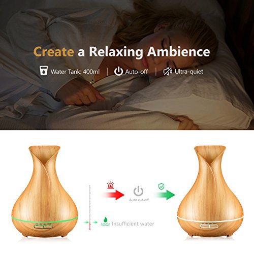 1) Larger Water Capacity: the water tank holds water up to 400ml in comparison with other 300ml essential diffusers, which provides 7-9 hours misting time;