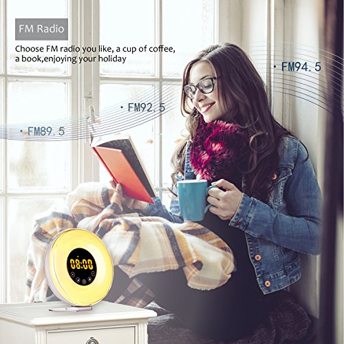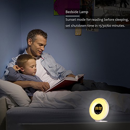 【Wake up Light】 No Heavy Sleeper is complete without this wake up light. 30 minutes before alarm time, the warm white light gradually brightens from 0% to 100% to gently wake you up naturally and comfortably. Press Snooze button when alarm sound playing to get an extra 5 minutes of sleep.