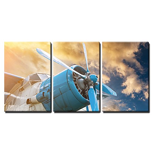 wall26 - 3 Piece Canvas Wall Art - Plane with Propeller on Beautiful Bright Sunset Sky Background - Modern Home Decor Stretched and Framed Ready to Hang - 24"x36"x3 Panels