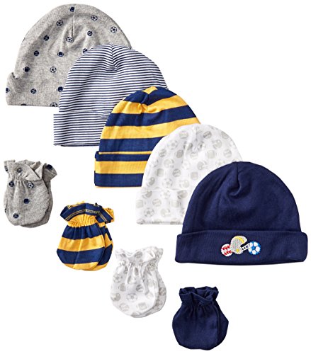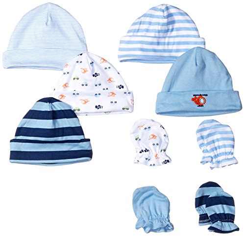 Gerber Baby Newborn 5 Pack Caps (0-6 months) and 4 Pack Mitten (0-3 months) Bundle Cute for Boys, Blue