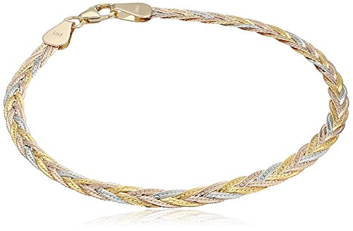 14k Gold Italian Tri-Color 5-Strand Diamond-Cut Braided Herringbone Bracelet, 7.5"