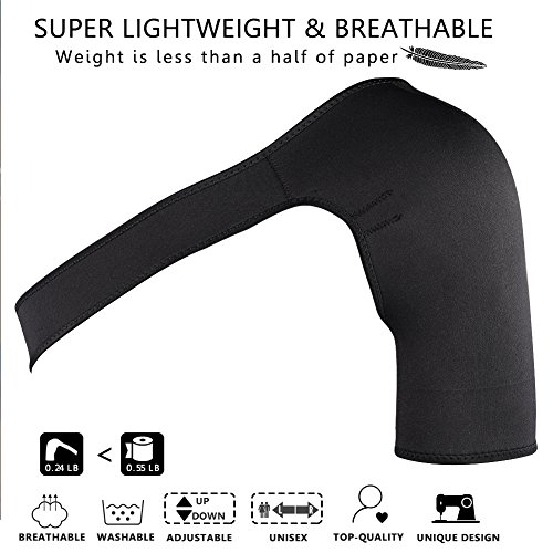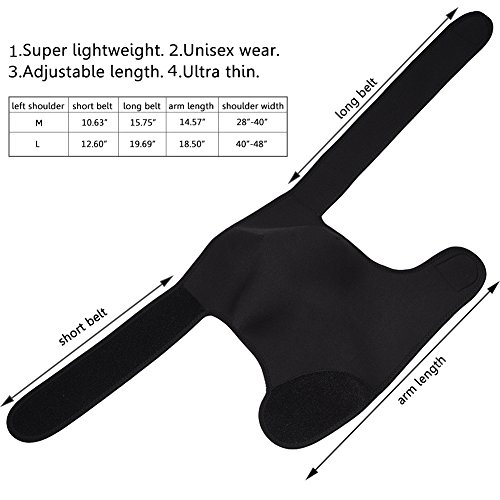 Why Choose Our?Shoulder Brace? Shoulder is a fragile part in human body. It easily gets hurt when you do some?activities, such as basketball, volleyball,baseball and?weightlifting.?Fortunately, our shoulder compression wrap has effective help for this situation.? Our shoulder wrap provides arm compression and shoulder tension to relieve pain and discomfort in shoulder area. It is conductive to improve overall stability in movement process by providing support to rotator cuff. Lightweight neoprene fabric and adjustable straps bring a comfortable and breathable experience. It will not loosen while using. It contributes to?injury?recovery, such as AC joints?injury,?shoulder dislocation, rotator cuff, sprains,labrum tear, arthritis, muscle soreness, and frozen shoulder pains. What Will the?Shoulder Compression Brace?Help? 1. Protect your shoulder from further injury. 2. Increase blood circulation?and speed up recovery process. 3. Provide gentle compression. 4.Strengthen muscle tightness? Parameter Adjustable size: Suit for shoulder width 28" -- 40" Color: Black Fits left shoulder for both men and women Package Included: 1 x Doact Shoulder Brace. Note:
