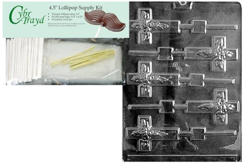 Cybrtrayd Cross Lolly Chocolate Candy Mold with Lollipop Supply Bundle, Includes 50 Sticks, 50 Cello Bags and 50 Metallic Twist Ties and Exclusive Cybrtrayd Copyrighted Chocolate Molding Instructions
