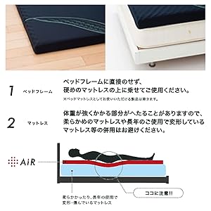 こちらはマットレスタイプです 床や畳に直接敷いても、お使いのマットレスに重ねてもお使いいただけるタイプです。 すでにお持ちのマットレスなどと組み合わせてのご使用をお考えになる場合は、組み合わせるマットレスの状態により、[エアー]本来の機能・効果を十分に発揮することが難しくなる場合があります。 ご留意ください。 |
