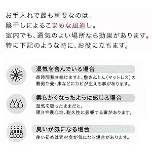 ウレタンフォーム製品を長くお使いいただくために ウレタンフォームは使用するたびに少しずつ身体になじみ、素材に柔らかみが出てきます。 初期は特に変化を感じやすいですが、一定の期間が経過すると安定してくるのが特徴です。 また、長持ちさせるためには、こまめな陰干しも重要です。 |