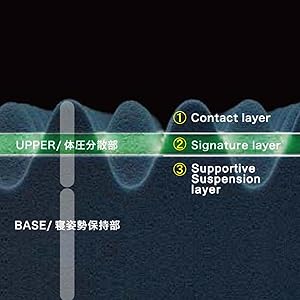 3層構造が全身を支える アッパー部で体圧を分散し、ベース部で体を支える ①身体を「点」で支え、圧力を受け止める ②体圧を分散 ③全身を支え、バランスのよい寝姿勢をキープ この①②③3層構造で寝返りもスムーズで気持ちの良い寝覚めが得られます |