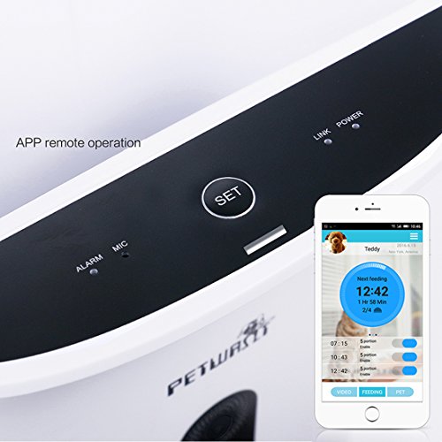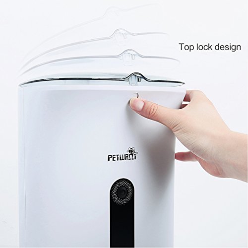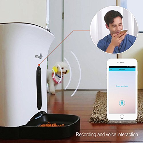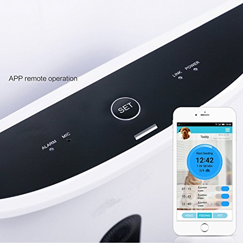 Product Description 1. Food capacity: 4.3 liters,suitable for dry food (diameter between 0.2~0.6 inch) 2. Capacitive touch buttons 3. Programmable to set 4 meals a day,1~10 portions adjustble per meal( 1 portion equals 10g) 4. Sensor inside to stop feeding program automatically once the dispensed food is over 13 portions in food tray. 5. 20 seconds' personal voice recordable and plays 3 times before food feeding starts. 6. Program easy to set 7. Program memory save feeding schedule when power cuts off 8. Powered by 3 pieces "D" sized battery or AC adaptor 9.Blue backlight big lcd display 10.With low power indicator