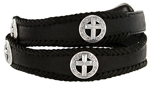 Binding : Apparel Product Description An oil-tanned harness leather belt with hand-laced edging, fitted with a sliver plated floral engraved rope-edged three-piece buckle set, ornamented with silver Christian cross conchos cast from hand-engraved masters. 1" wide with 1 and 3/8" scallops. Our belts are measured from where the leather ends at the buckle end to the middle hole at the tip end. 0