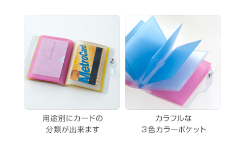 ●カラフルな色付きポケットで、用途別に分類しやすい24ポケットカードホルダー