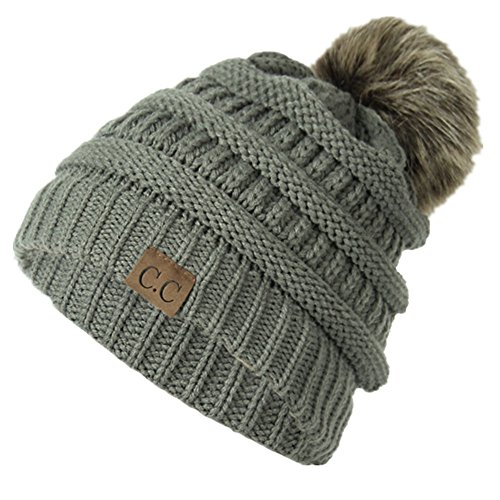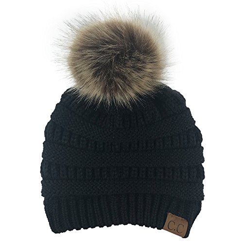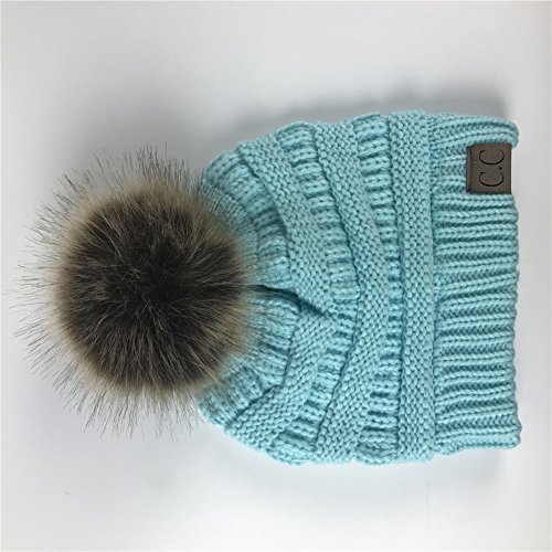 Womens Winter Warm Wool Knitted Beanie Detachable Fur Ball Caps Faux Fur Pom Hat
