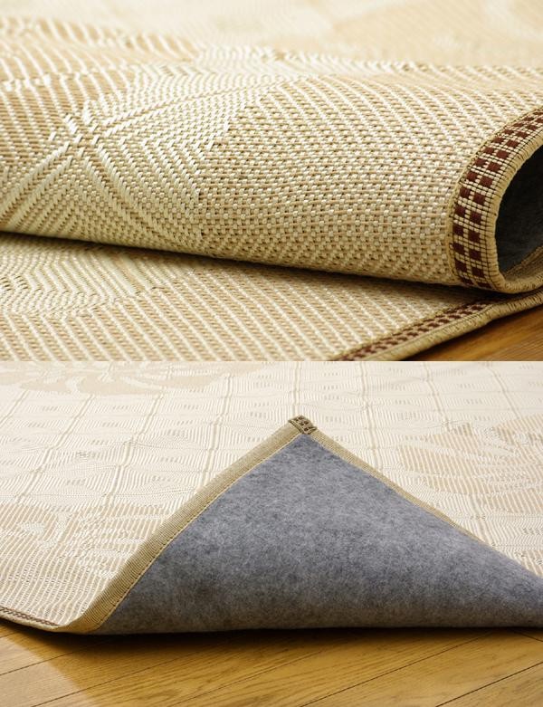 | 麻の一種であるジュート糸と、ポリエチレン糸のジャガード織のカーペットです。裏面にはフローリングを傷つけにくいよう不織布を貼っています。 |