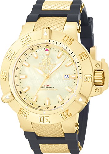 The Invicta Men's Subaqua Noma III Collection GMT Watch is a gold-forward timepiece that sparkles with an 18k gold-plated stainless steel case and bezel. Even the black polyurethane strap is studded with pineapple-textured 18k gold inserts, and it has a gold buckle clasp, besides. The gold inner bezel lined with black Arabic numerals from 1 to 24 serves as a GMT function, along with a little help from a silver hand that's capped by a red arrow. The luminous mother-of-pearl dial features gold-toned hands orbiting around shiny gold bullet indexes. The three o'clock position provides a date display within a gold-framed window. A trio of gold push-buttons gives added texture to the unidirectional outer bezel, which is engraved with gold-on-gold Arabics from 5 to 55. Water-resistant to 1640 feet (500 meters), this watch utilizes flame-fusion crystal to protect against scratches and has precise Swiss quartz movement.Subaqua Collection