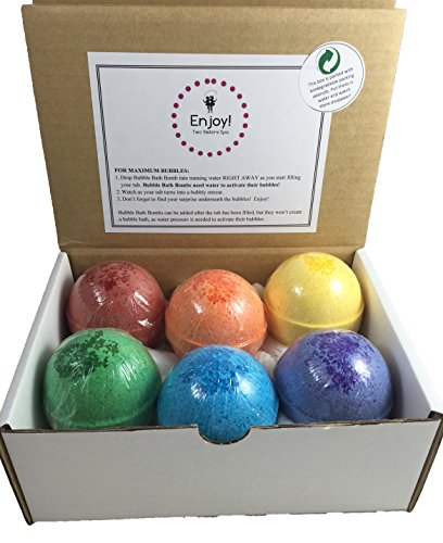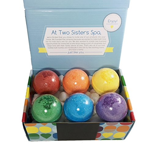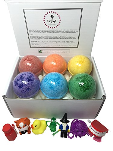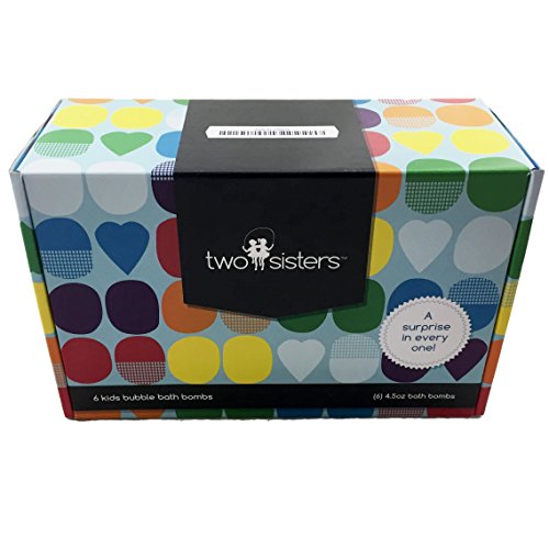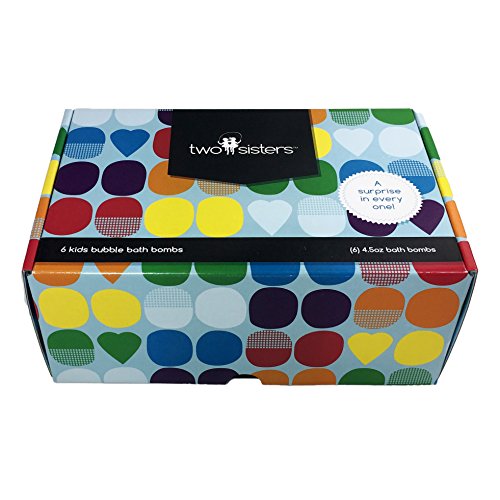 Studio : Two Sisters Spa Publisher : Two Sisters Spa Binding : Misc. Product Description This 6-pack of bath bombs includes 6 different colored/scented bubble bath bombs with gender neutral surprises inside: Red - Cherry, Orange - Citrus, Yellow - Banana, Green - Fruit Loops, Blue - Berry, Purple - Grape. Examples of Surprises that might be inside: Bubbles, Mini Water Guns, Silly Monkeys, Dice, Stampers, Cars, Animals, Sticky Hands, Bouncy Balls, Stampers, Tops, Mini Puzzle Games, and more. These bath bombs weigh 4.5 oz each and are almost the size of tennis balls. All of our bath bombs are made with sodium bicarbonate, citric acid, Epsom salts, sodium lauryl sulfoacetate, essential oils or fragrance oils, olive oil, shea butter, water-based colorant, and witch hazel. How to use: For a Bubble Bath, drop bath bomb under running water as you start to fill your tub. Watch for your surprise to appear as the bath bomb dissolves! Bath Bomb can be added after the tub is full, however it won't create a bubble bath, as the water pressure is necessary to activate the bubbles. 0