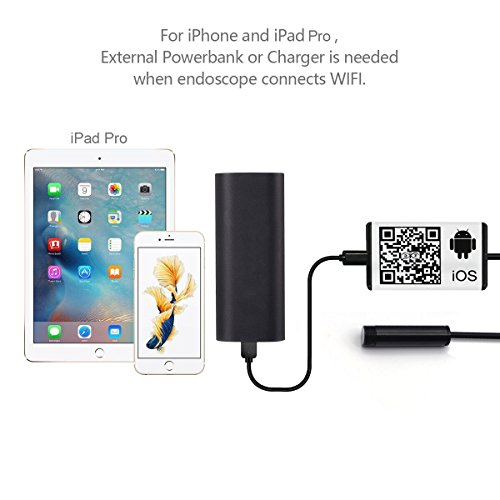 -. Feature : Newest Endoscope: The WIFI Endoscope can support all Android phones and iPhones (iPhone 4s/ 4 not included) and IPad Pro. As to WiFi connection, you do not need to be on a local WiFi connection, it creates its own WiFi network when you turn it on. Support 4 devices at most connecting to the WiFi at the same time. / High Resolution: Comes with 2 megapixels CMOS camera, which provide you clear close range HD video and snapshot image. The ability of record video (ios devices not supported) or snap still images allowing you capture image in JPG format and video in AVI format with 320x240, 640x480, 1280 x 720 three adjustable resolutions. / Featuring 3.5M cable, waterproof and 9mm diameter camera, It works well with 6 tiny white LED's that are adjustable from OFF to full brightness for those dark places you want to look into. / Multipurpose Camera: This inspection camera has many applications including ear, nose oral & throat treatment, HVAC inspection, vent pipe, machine equipment, engine, automotive, boat, parts assembly,construction sites, Wind Turbines, aircraft inspection. / Easy to set up:First, Search "XJ_endoscope" in App store(Android not included) or scan QR code, enter interface to download App;Second,use the device in 2 ways:When using scope, connect with a power bank or 5v power supply through data cable.②powered by phone with OTG cable(phone must have OTG function).Thirdly, 30S after connecting to the power supply, open phone wifi settings and find the "XJendoscope_xx:xx:xx", connect it and type password.Finally, open app and click icon, just use the scope.