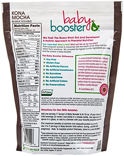 -. Binding : Health and Beauty -. Brand : Baby Booster -. Department : womens -. EAN : 0855947005126 -. Feature : All Natural and OB/GYN Approved / 20 grams of Whey Protein per serving / Vitamin B6 (may soothe morning sickness nausea) and Life's DHA (vegetarian source) / Caffeine Free -- Gluten Free -- Soy Free -- Non GMO Protein / Mlik or Water Soluble -. Label : Baby Booster -. LegalDisclaimer : This product and the claims made this specific product have not been evaluated by the United States Food and Drug Administration, and the product is not intended to diagnose, treat, cure or prevent any disease. -. Manufacturer : Baby Booster -. Model : POU103 -. MPN : POU103 -. PackageQuantity : 1 -. PartNumber : POU103 -. ProductGroup : Health and Beauty -. ProductTypeName : HEALTH_PERSONAL_CARE -. Publisher : Baby Booster -. Studio : Baby Booster -. Title : Baby Booster Prenatal Protein Powder - Kona Mocha - 1 lb. Bag -. UPC : 855947005126