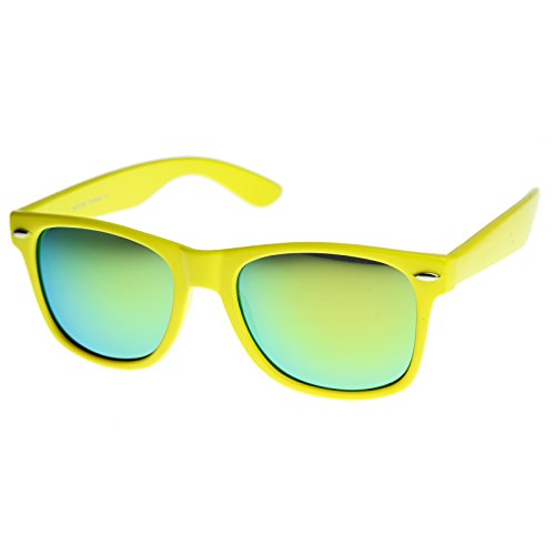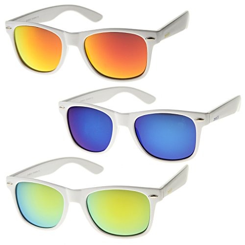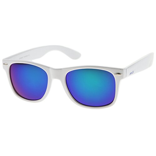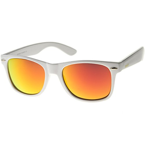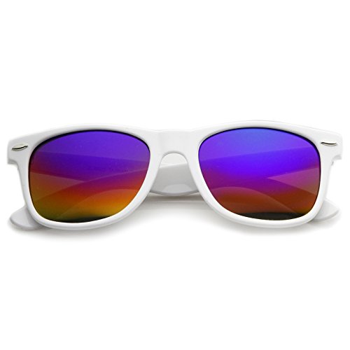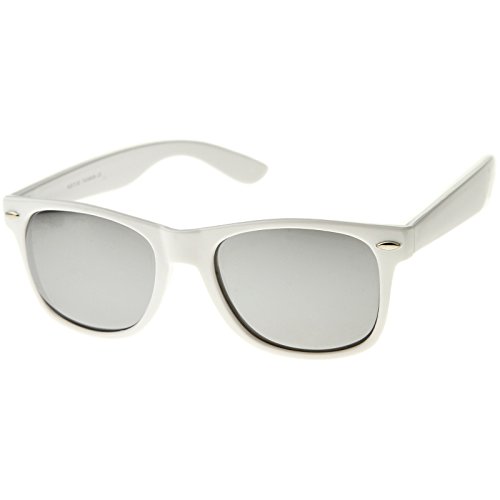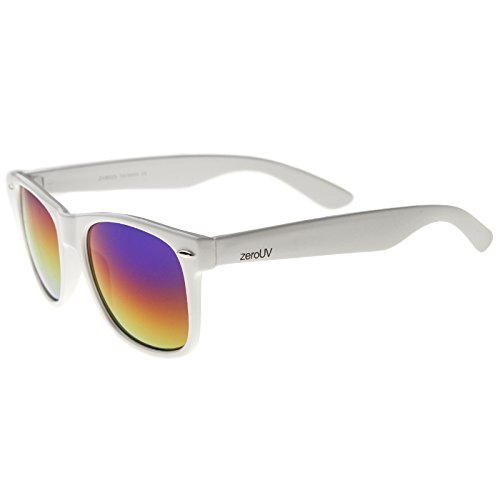 Cool white frame version of the timeless classic horn rimmed sunglasses that features vibrant reflective color lenses. Stylishly wide high sitting temples and metal accents at the front complete these must-have sunglasses. Made with an acetate based frame, metal hinges and color mirror polycarbonate UV protected lenses. Product description provided by zeroUV. Lens Height: 43 mm | Lens Width: 55 mm | Bridge: 18 mm | Frame Total: 145 mm