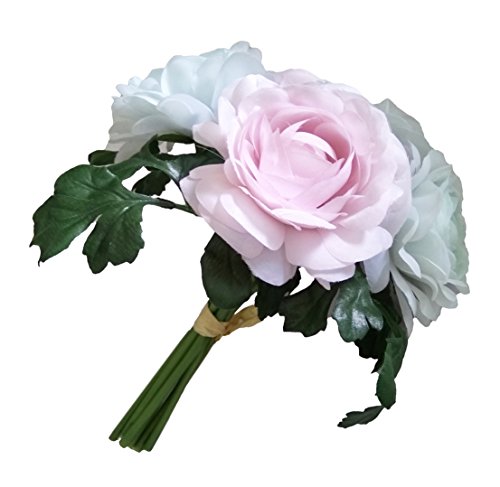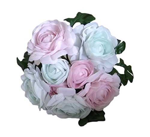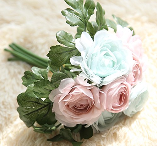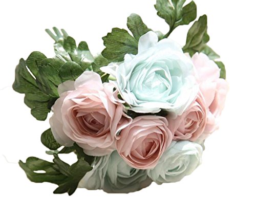 Linshing-Artificial 8 Heads Tea Rose Silk Bouquet for Bride Bridesmaid or Wedding Decor Light Pink and Blue