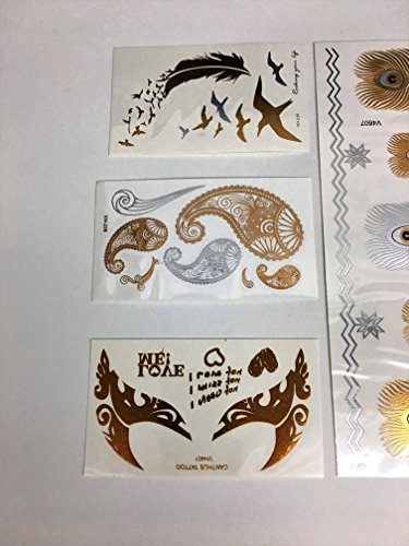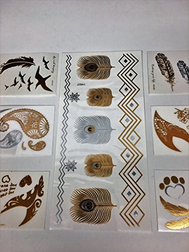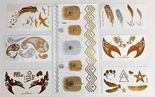 Metallic Temporary Fake Tattoos Feathers & Eyes Pack Long Lasting Premium 7 Sheets Beautiful Gold & Silver Shimmer Intricate Designs For Hand Wrist Neck Ankle Arm Women Teens Girls Flower Heart