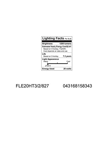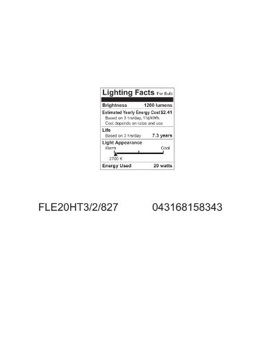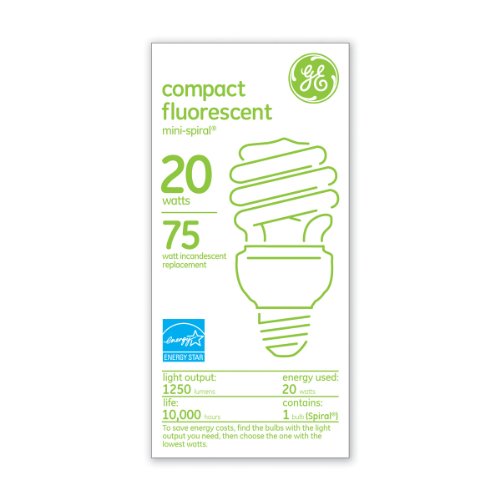 Studio : GE Lighting Publisher : GE Lighting Binding : Tools Home Improvement Product Description GE 15834 20-Watt CFL Self-Ballasted Spiral Soft White Spiral T3 - Facilities. Features and Benefits: Up to 75 percent energy savings. One piece unit screws directly into incandescent sockets. T3 Spirals lamps provide economical solution with small overall size. Long life -8000-12,000 hour rating, Color Rendering Index (CRI): 82, Color Temperature: 2,700 K, Initial Lumens [Nom]: 1,200.00, Input Current: 0.3000 A, Input Voltage: 120 V, Maximum Overall Length (MOL): 4.7000 in, Mean Lumens [Nom]: 965, Mercury Content: 5.000 mg, Nominal Initial Lumens per Watt: 60, Nominal Length: 4.700 in, Picograms of Mercury: 647.7 pg, Power Factor: 0.600000023841857, Product Technology: Compact Fluorescent, Rated Life [Nom]: 8,000-Hours, Starting Temperature [Min]: -15 -DegreeC, Total Harmonic Distortion (THD): 135.000 percent, Voltage [Nom]: 120, Wattage: 20GE Compact Fluorescent lamps (CFL) offer many advantages that include cost savings, extra long life, light output, and color rendering. With this CFL you'll get dramatic energy cost savings. up to 77 percent vs. incandescent lamps of comparable light output. The extra long life. most last 8 to 10 times longer, and some last up to 20 times longer, than standard incandescent lamps. High light output comparable to, and in many cases exceeding incandescent lamps replaced. Excellent color rendering. rare earth tri-phosphor provides such high-quality color you won't believe it's fluorescent. Many lamps use amalgam technology which provides stable lumen performance when operated in any position, over a wider, range of ambient temperatures. For product questions regarding GE Lighting products, please call GE Hotline 1-800-435-4448, Monday ? Friday, 8:00 a.m. - 6:00 p.m. EST Follow the recording prompts or ‘stay on the line’ to speak directly to a customer service rep. 0