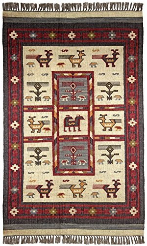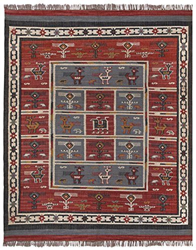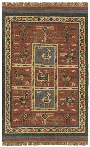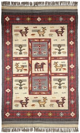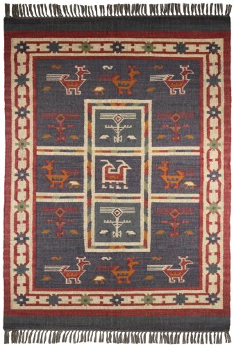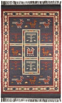 The hacienda collection of wool flat weave rugs are a mix of ancient tribal motifs and new contemporary designs. These beautifully durable rugs are painstakingly crafted by hand-weaving 100-Percent wool yarns through a jute warp, creating a detailed and tightly woven foundation. It is this tight weave that helps these beautiful rugs lay flat and wear well. At the ends, a soft knotted grey fringe adds to the overall distinction of this reversible rug. The tribal is a centuries old design carefully woven in primary colors of blue with a red border and intricate panels artistically decorate the rug with secondary colors of beige, sage, orange and blueberry.Feature