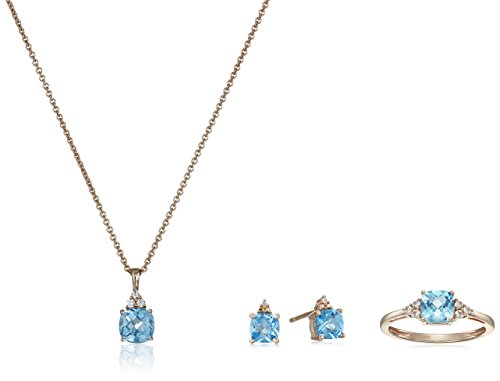 -. Binding : Jewelry -. Brand : Amazon Collection -. Color : Blue -. Department : womens -. Feature : Three-piece pendant necklace, earrings, and ring set in rose gold-plated sterling silver each featuring a faceted blue topaz in four-prong setting with created-white sapphire cluster / Imported -. Label : Amazon Collection -. Manufacturer : Amazon Collection -. Model : 474835/STGSIL/P/YY/N557/SIL030RLO/STD -. MPN : 474835/STGSIL/P/YY/N557/SIL030RLO/STD -. PackageQuantity : 1 -. PartNumber : 474835/STGSIL/P/YY/N557/SIL030RLO/STD -. ProductGroup : Jewelry -. ProductTypeName : FINEOTHER -. Publisher : Amazon Collection -. Studio : Amazon Collection -. Title : Rose Gold-Plated Sterling Silver Checkerboard Swiss Blue Topaz with Created White Sapphire Ring, Earrings and Pendant Necklace Jewelry Set