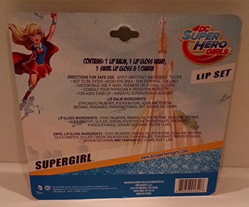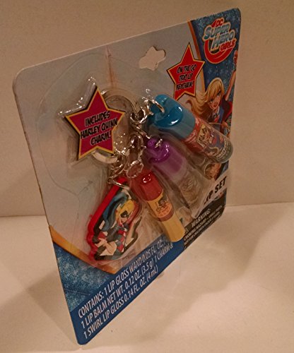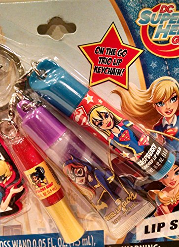 A DC Super Hero Girls themed lip care keychain set! Includes 1 Wonder Woman lip gloss wand, 1 Supergirl raspberry lip balm, 1 Batgirl grape swirl lip gloss, and 1 Harley Quinn charm - all on a keychain.Feature