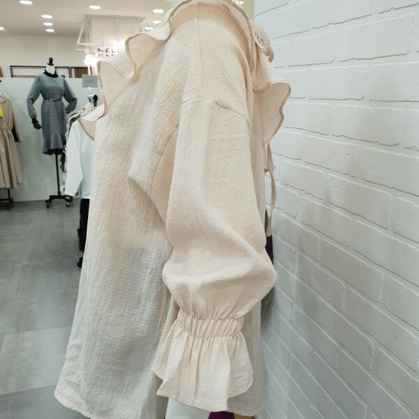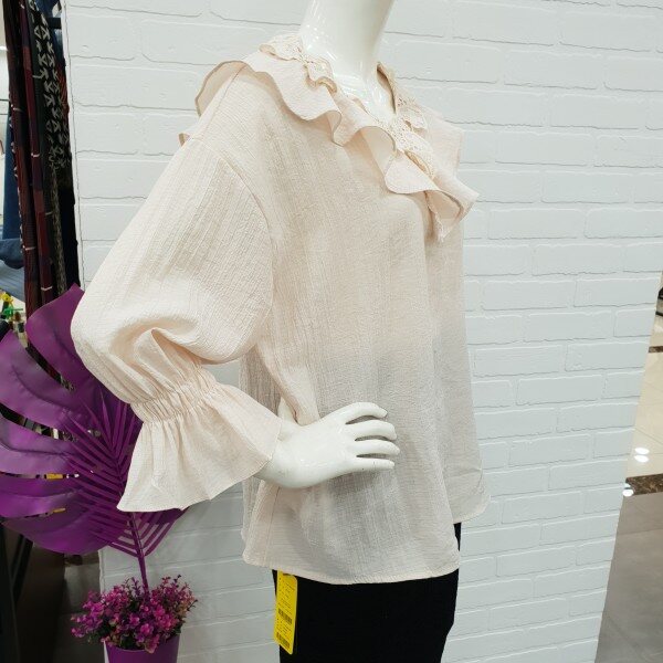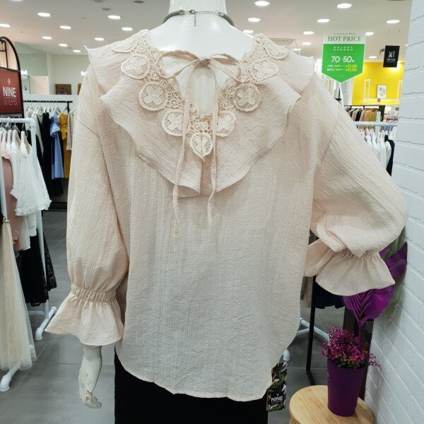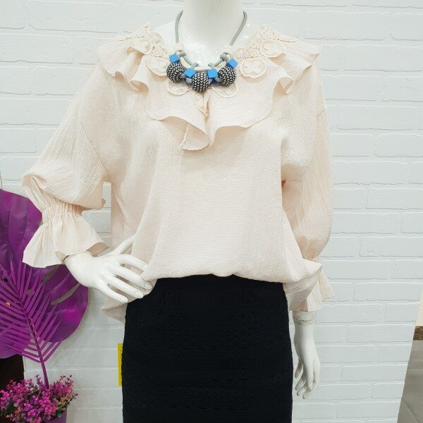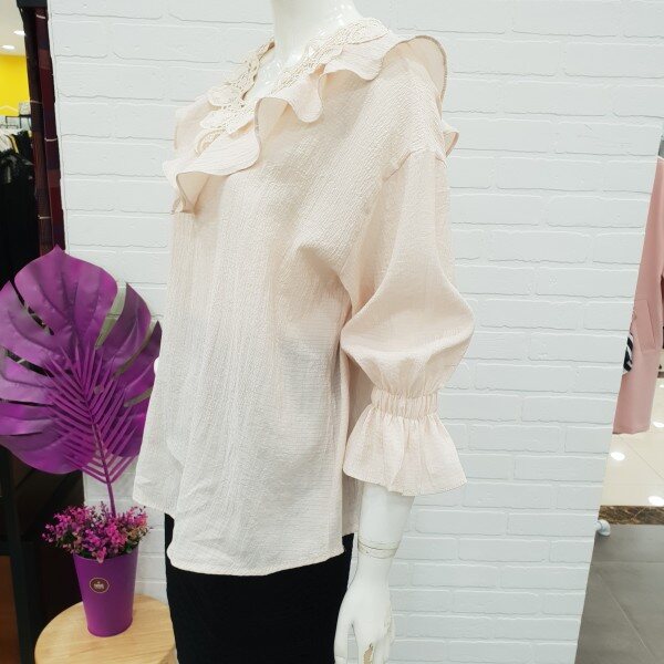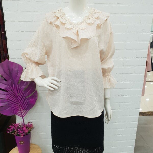 너무예쁘죠!스커랑입으면 여성스럽고 팬츠랑 입으면 귀여우면서 통통튀는 발랄함까지... 여러모로 다양하게 연출할수있는 블라우스예요.네크라인의 자수레이스가 고급스러움과 프릴이 너무나 마음에 드는 블라우실 꺼예요.소매단의 밴드또한 소매라인을 살려주는데 한몫해주구요.넉넉한품으로 루즈하게 떨어지는 핏도 굿이예요~