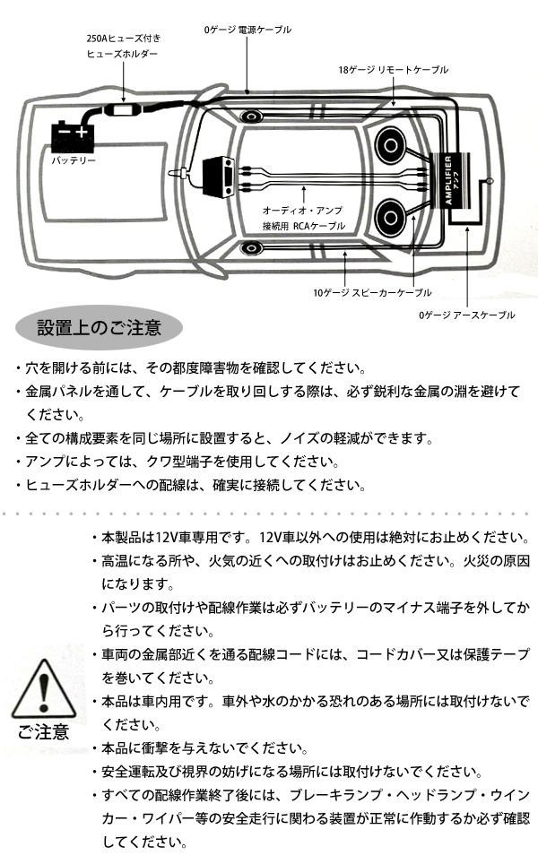 | セット内容 | 0ゲージ・電源ケーブル(赤):5m オーディオ・アンプ接続用RCAケーブル(緑):5m 18ゲージ・リモートケーブル(青):5m 10ゲージ・スピーカーケーブル(緑黒):6m 0ゲージ・アースケーブル(黒):1m ヒューズホルダー+ヒューズ(250A) ターミナル一式・配線止めバンド |