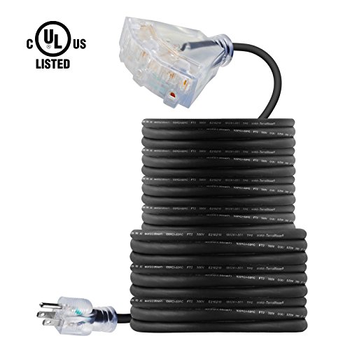 TerraBloom 50 Ft 14/3 Black Extension Cord With Lighted Triple Tap Outlets. Extra Flexible SJEOW TPE 125 Volts 1875 Watts Power Cord. All-Weather Heavy Duty For Outdoor, Garden and Major Appliances