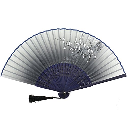 Perforated Wood Folding Fan - Cherry Blossom Print Fabric - Blue With Gray