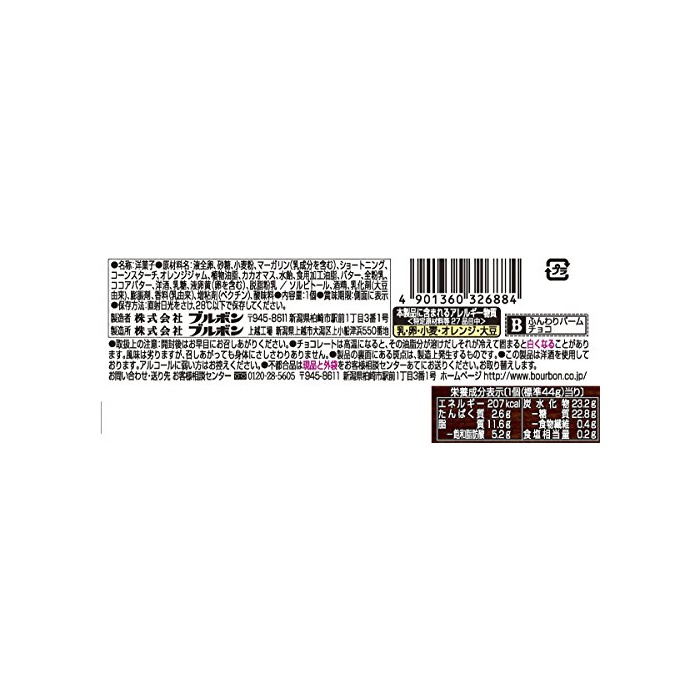 원재료:액전알,설탕,소맥분,마가린(유성분을 포함한다)고, 쇼트닝,콘 스타《지》,오렌지 잼,식물성 기름지,카카오 마스,수 엿,식용 가공 유지,버터,전분유,코코아 버터,양주,유당,액계란 노른자(알을 포함한다)고, 탈지분유 / 솔《비토루》,주정,유화 제(대두 유래)고, 팽창 제,향료(유유래)고, 증점제(백 친)고, 신맛료