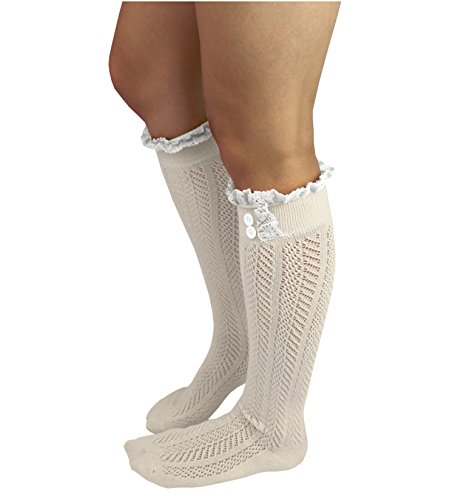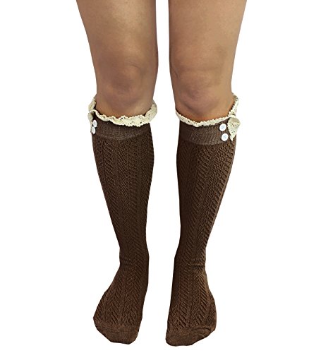 -. Binding : Apparel -. Brand : CL Couture -. Department : womens -. Feature : DESIGN: Soft knit design made with 95% Cotton and 5% Spandex / PRODUCT FIT: One Size fits most. Measures 16-18" from the heel to the lace trim, fits calves up to 17" in circumference / QUALITY GUARANTEE: CL Couture (TM) branded items owned by Emerald Discounters come with a 90 day limited warranty / CARE GUIDELINES: Hand wash in cold water and lay flat to dry to keep your socks beautiful for years to come. / FASHION SOCKS: Keep on trend year round with these versatile socks. Pair with your favorite boots, or wear alone. -. IsAdultProduct : 0 -. ProductGroup : Apparel -. ProductTypeName : SOCKSHOSIERY -. Size : One Size -. Title : Knit Button Boot Socks with Lace Trim Knee High Socks by CL Couture