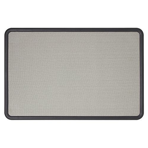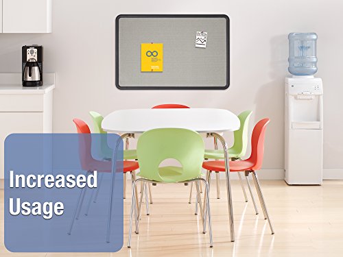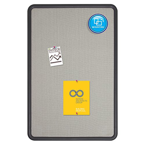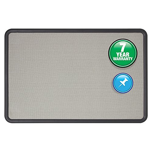 Durable gray-fabric bulletin board surface backed by high-density fiberboard holds documents securely in place; Black plastic frame and coordinating fabric surface looks great in any office décor