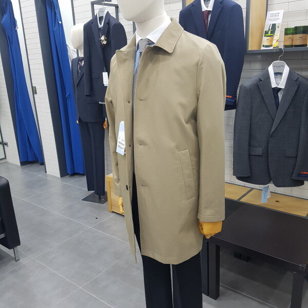 진한베이지의 스탠카라 트렌치코트이며스타일리쉬한 느낌을 주며 맞혀 입기가 쉽다