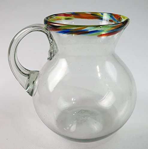 Studio : Mexico Publisher : Mexico Product Description Mexican Glass Margarita pitcher hand blown, round or bola (bowl shape), Confetti Rim design. Great for ice tea or juice or endlessly adaptable, for other beverages. These pitchers are handcrafted in the area around Guadalajara, Mexico by individual artist, using glass-blowing techniques perfected over generations. Mouth-blown lead-free glass. The pitchers measure approximately 7 1/2 inches tall and 8 inches wide. The pitcher holds approximately 2 quarts. Please note that as each piece is individually handmade, slight variations in the shape and size of the glass are likely, making every item a distinct example of blown glass craftsmanship. Tiny bubbles within the surface exemplify this singular, rustic technique. This pitcher is also available in a straight shape design. See sample photo, not included with round pitcher. ONLY. Care instructions: Our Mexican Glassware is individually mouth blown, hand formed and made from recycled glass. Trapped bubbles and slight variations in form, capacity and color are natural and charming features of the glassware. Although it is quite durable, this glass is not tempered so some extra care is necessary. A cooling-off period is essential after the glassware is removed from the dishwasher. Extreme temperature changes may cause thermal shock and cracking. This glassware is not suitable for serving hot beverages. 0