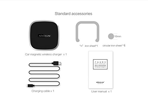 Package Contents: Nillkin Car Magnetic Wireless Charger, "n" iron sheet, circular iron sheets*6, Micro USB cable, User Manuel.