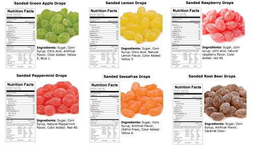 •List of candy drops in your variety pack: Claey's Sanded Peppermint Drops, Claey's Sanded Lemon Drops, Claey's Sanded Green Apple Drops, Claey's Sanded Raspberry Drops, Claey's Sanded Root Beer Drops, Claey's Sanded Sassafras Drops.