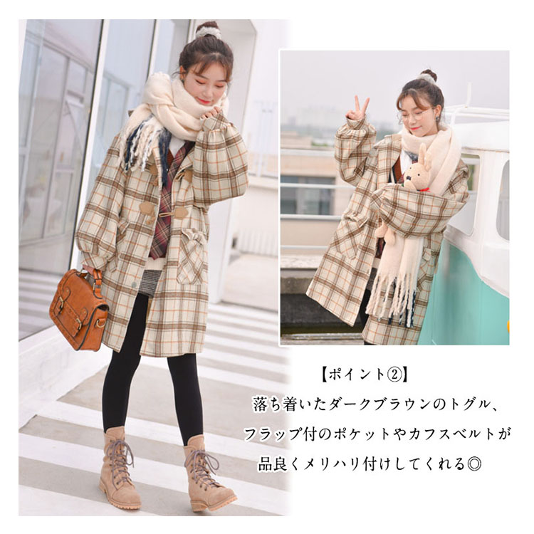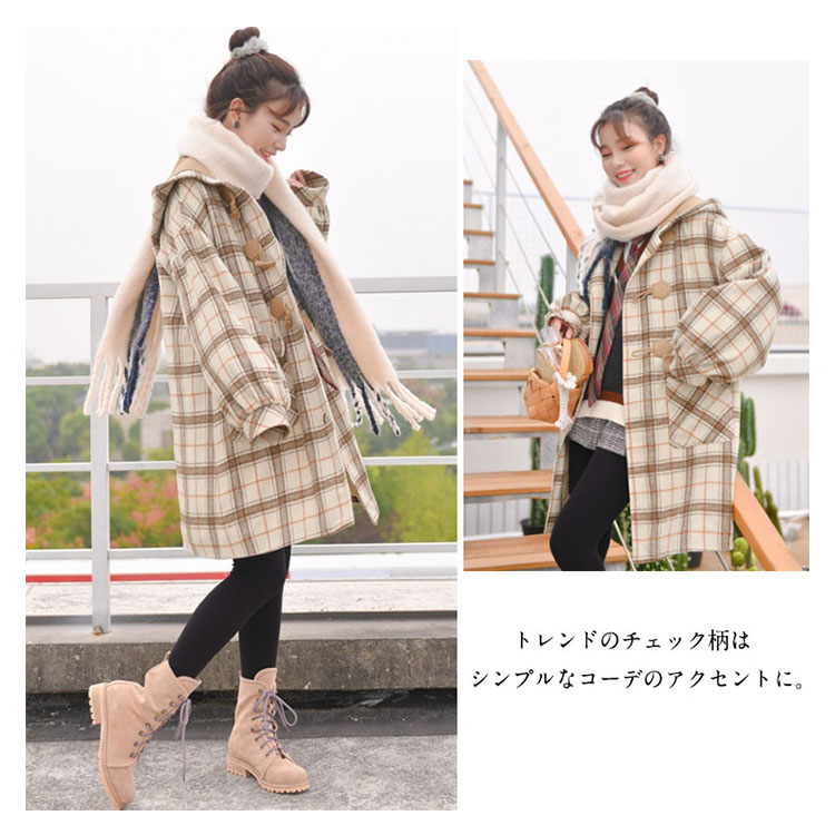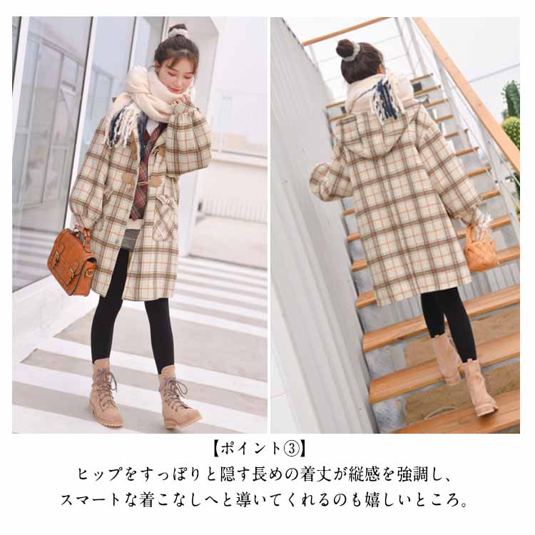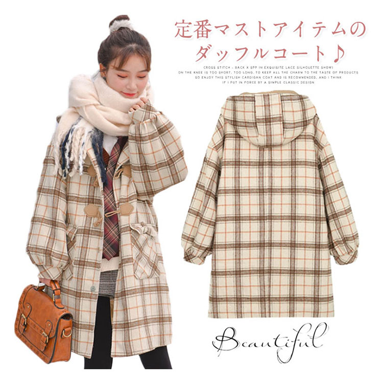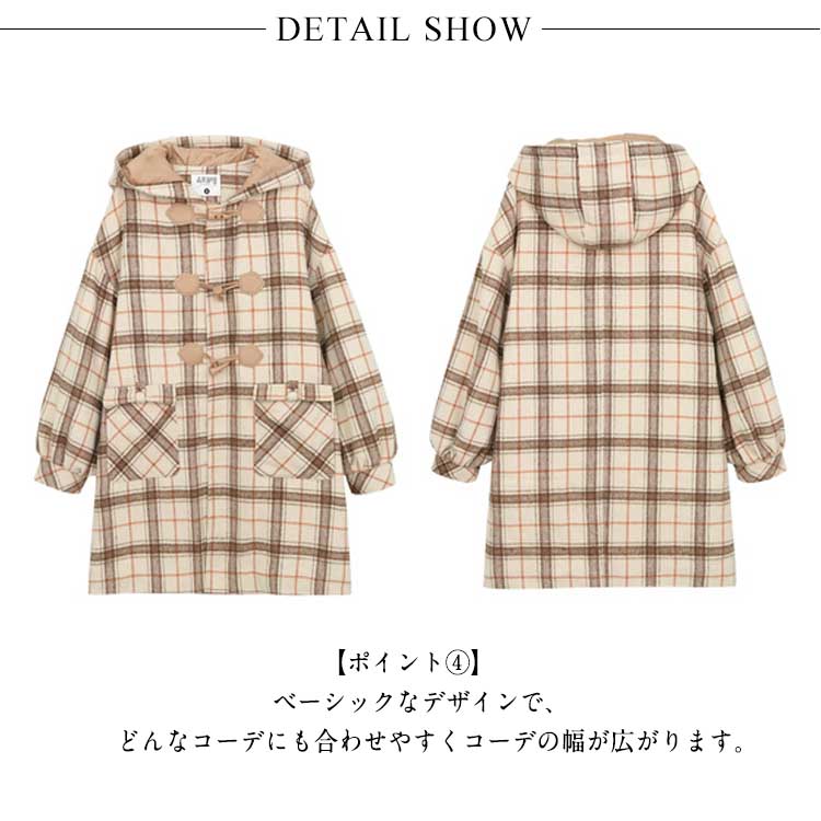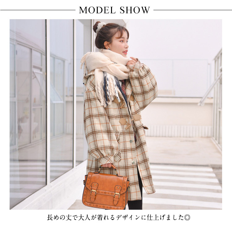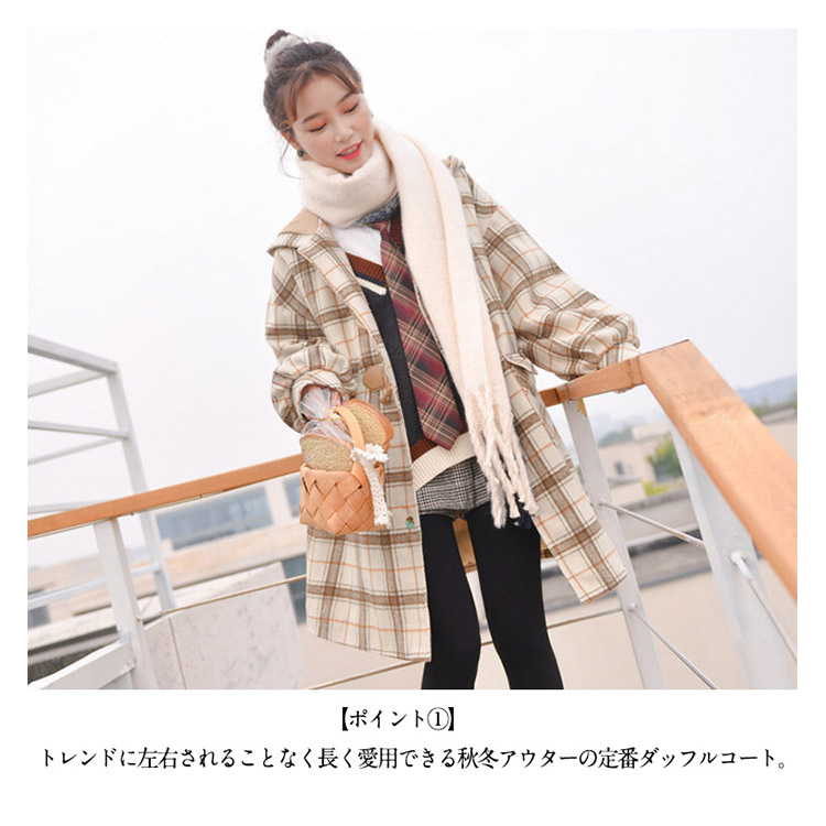 | 定番マストアイテムのダッフルコート♪長めの丈で大人が着れるデザインに仕上げました◎トレンドのチェック柄はシンプルなコーデのアクセントに。ON/OFF問わず着用できるのも嬉しいポイントです。 | |
