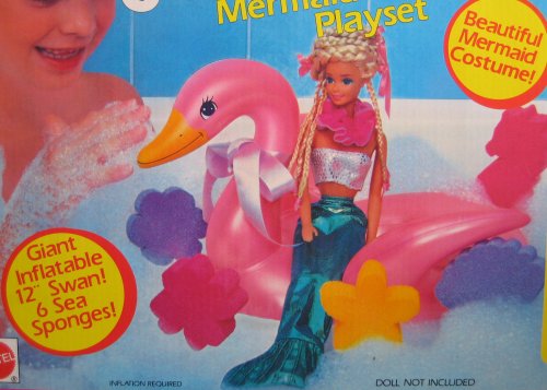 - Feature : Bathtime Fun Barbie Mermaid & Swan Playset is a 1990 Arco Toys Ltd, A Mattel Company production. / Includes: 12" Inflatable Swan, Ribbon to tie around Swan's Neck, 6 Sea Sponses in different shapes & sizes (child size for bath play), & a Beautiful Mermaid Costume for Barbie Doll. / Mermaid Costume, that includes a shimmery opalescent green long Skirt w/Tail, & a white w/glittery green dots Halter Top, and a pink & purple tulle ruffled Neck Piece; Mermaid fashions fit most Barbie & 11.5" size fashion dolls; dolls NOT included. / Mermaid costume is for the Barbie Doll. For Ages 3+ Years. WARNING: Choking Hazard/Small Parts. / See more details below in Product Description. Great for any collection, as a gift or just for fun play!
