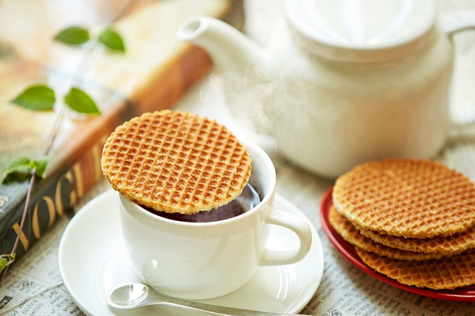 As for how to eat Dutch flow, put on a lid on a cup which poured hot coffee or tea and warm up waffle with steam.