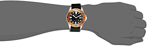 Stainless steel round shaped case and orange plated undirectional ratcheting bezel with printed tachymeter Protective anti-reflective sapphire on front and decorated screw in case back Black matte finish dial with printed light green luminous markers and date window at three o'clock position Black canvas strap with silvertone buckle Water-resistant to 50 M (165 feet)