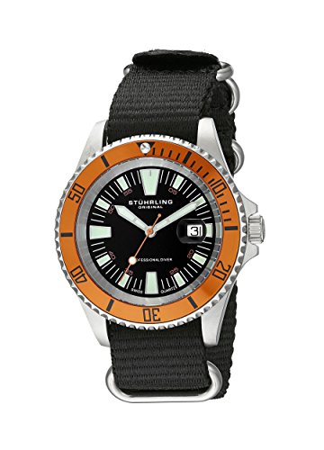 A durable canvas strap enriches the masculine, sporty appeal of Stuhrling Original's "Aquadiver Regatta Bravura," a stainless steel design with a matte finish dial and vivid orange bezel.